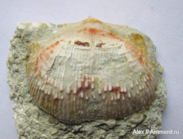 Створка раковины брахиоподы Admoskovia inflatiformis. Найдена в глинах касимовского яруса верхнего карбона в карьере Цемгигант. Красный цвет на раковине - следы красных глин, в которых находилась брахиопода. Точнее, раковины расположены на границе слоев - они лежат на плотных мергелях зеленоватого цвета, но в красных мягких глинах.