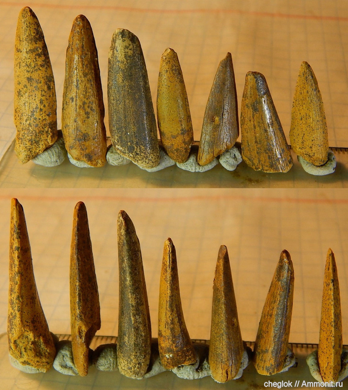 за несколько поездок в Шацк набралось зубов костных рыб, эти самые выдающиеся. Длина крайнего левого около 37 мм, правого -- 25 мм.