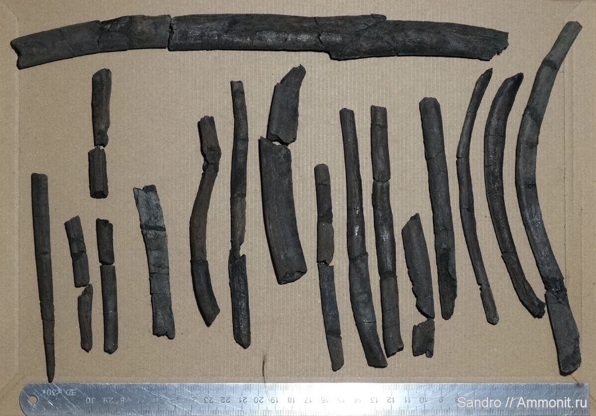 Странно... Предположим, что это ребра одного завра. Лежат в песчано-глинистой породе и как-бы от одной части, т.е. скорее всего не были перемыты. Завр погрузился в донные отложения. Ну допустим остальное растащили морские и не очень хищники в прибрежной зоне или глубине. Почему же тогда только ребра? Ребра куском не откусываются и не выделяются отдельным блоком из скелета... Странно... | ||||||