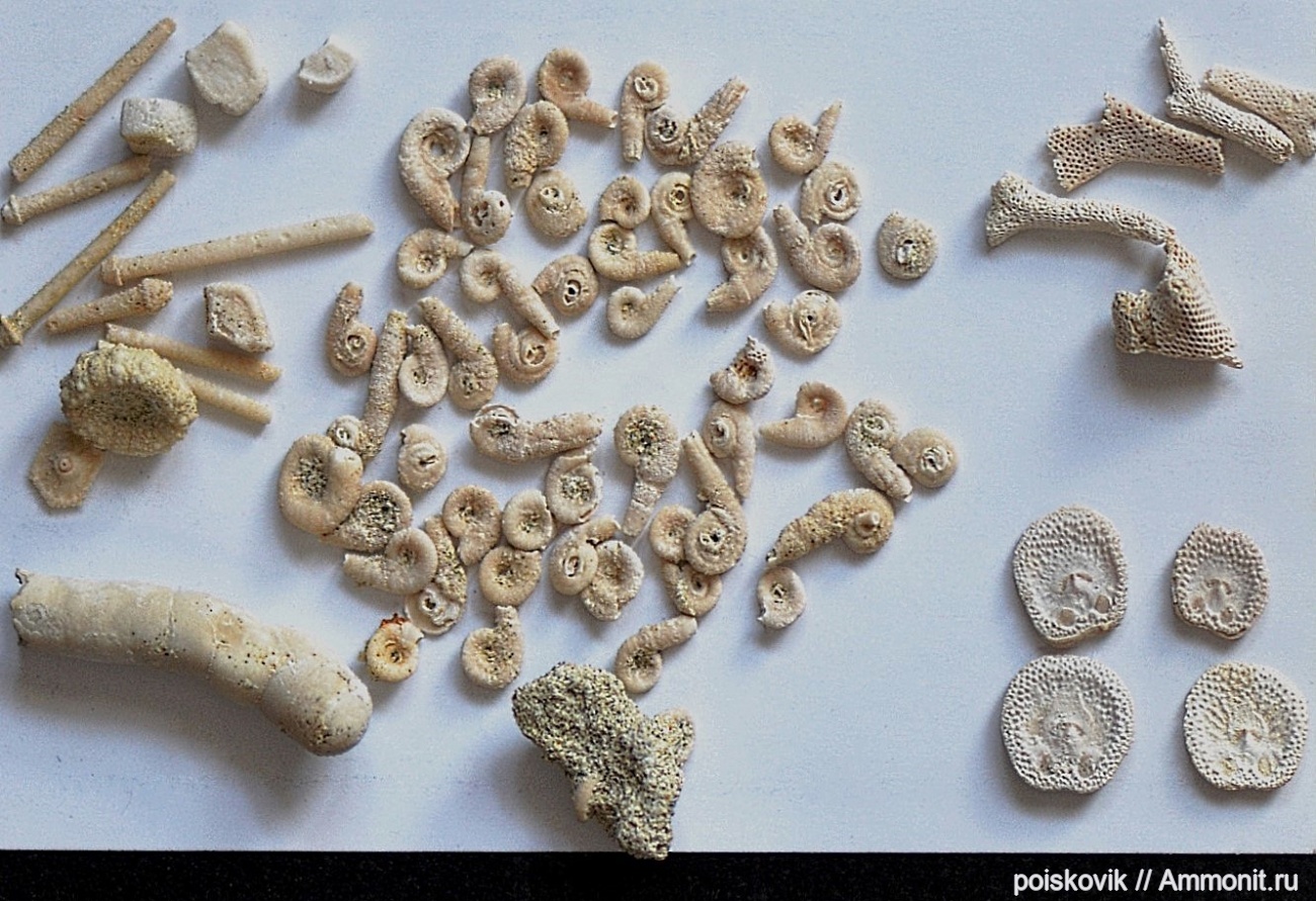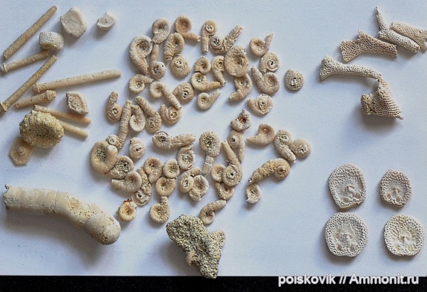 Серпулы, брахиоподы, морские ежи, мшанки из датской куэсты урочища Медведь (см.Фото) в районе п.Куйбышево.