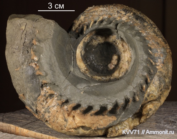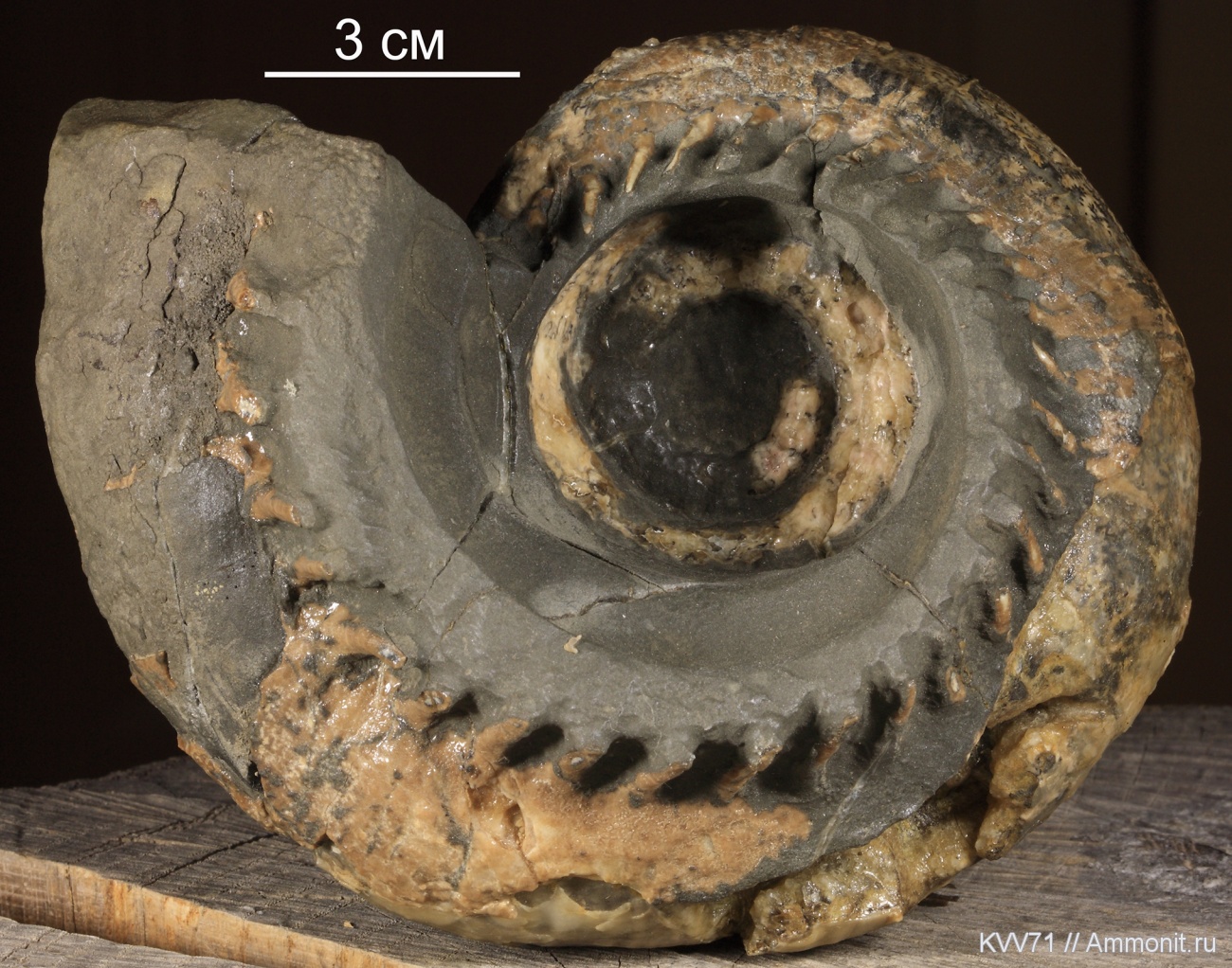 Замечательный аммонит. Я помню его не отпрепарированным, тогда казалось, что у него не шипы, а широкие воротники. А оказалось вот как. Шипастых литоцерасов относят к роду Cicatrites, у Омара есть такие находки. Но наличие названия не означает, что они хорошо изучены. Пока тут вопросов значительно больше, чем ответов, и находка очень ценная - может быть с его помощью удасться разобраться в формировании этих шипов-воротников. | ||||||