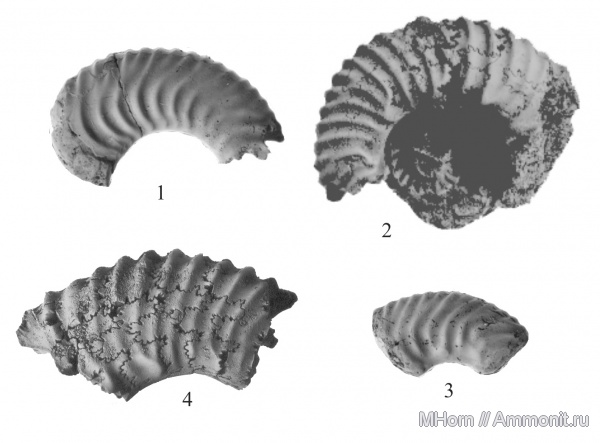1-3. Gregoryceras cf. romani (Riaz); пограничные слои зон densiplicatum и tenuiserratum; фиг.1,3 – экз. без номера, Болошнёво, фиг.2 – экз. ГИН МК 61, карьер Стойленского ГОК, кровля сл.5 б; фиг.4. G. cf. transversarium (Quenst.), экз. ГИН МК 225, карьер Стойленского ГОК, подошва сл.6, средний оксфорд, зона tenuiserratum (?)