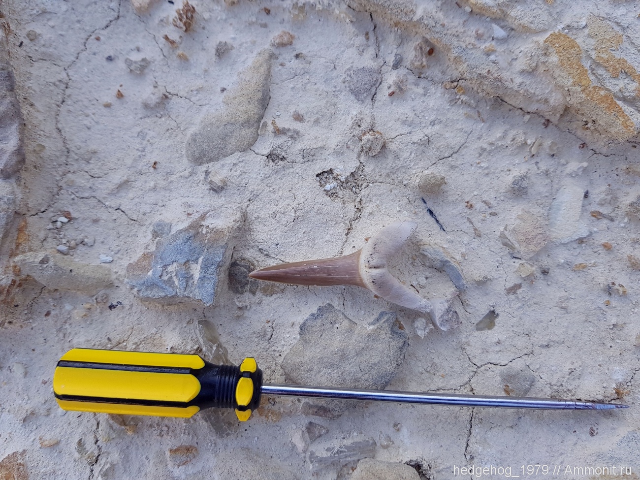 Шорымская свита, Местонахождение Усак, п-ов Мангышлак; найден 21.09.2017. Возраст: Кайнозой, Палеоген, Эоцен, Бартон (41-38 млн. лет). Длина зуба: 53 мм.