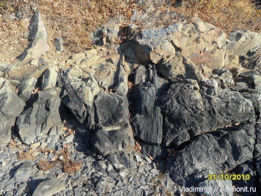 13.07.12г. По определению сделанному старшим научным сотрудником Биолого-почвенного института ДВО РАН, кандидатом биологических наук Афониным М.А. в своей научной работе «Первые находки ископаемых древесин Xenoxylon latiporosum (Cramer) Gothan и X. hopeiense Chang на Дальнем Востоке России» на фотографии запечатлен «фрагмент ствола Xenoxylon hopeiense Chang» в отложениях липовецкой свиты, датируемых аптским веком.
