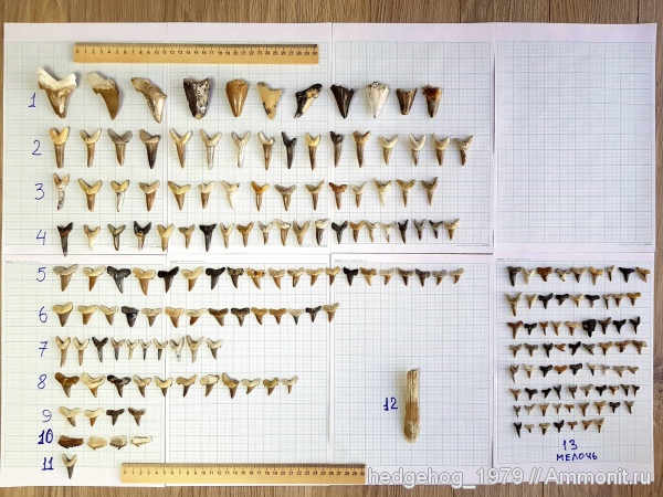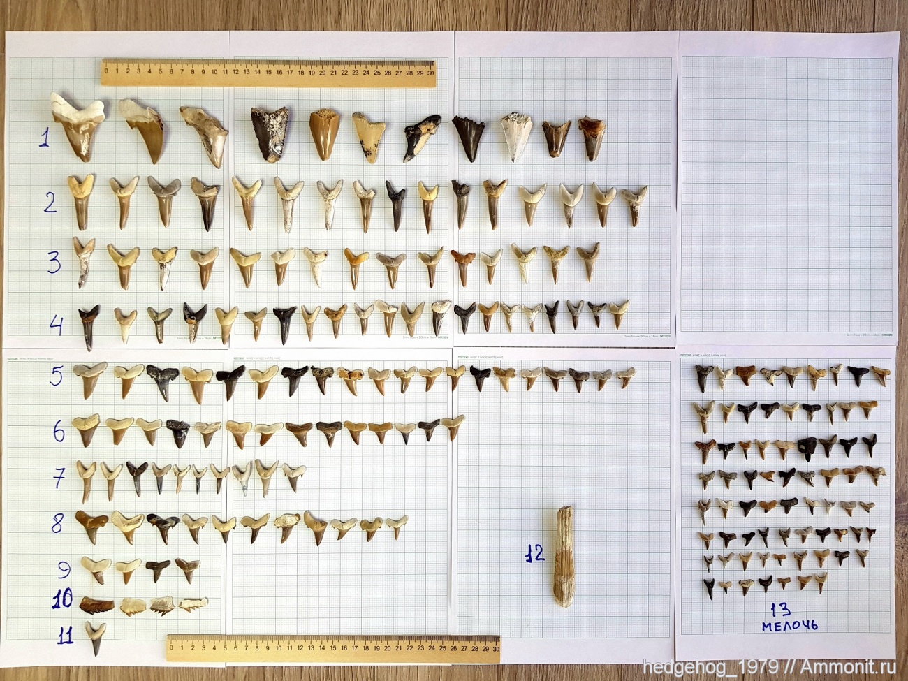 Во 2,3,4 рядах не только Striatolamia, но еще и Jaekelotodus trigonalis, Macrorhizodus praecursor и может еще кто-нибудь. И 9 ряд не похож на Isurolamna, а скорее Macrorhizodus. Носовой остросток скорее всего рострум рыбы Cylindracanthus, она не имеет отношения к осетровым. В общем, для более точного определения нужно больше фото. Но образцы отличные!