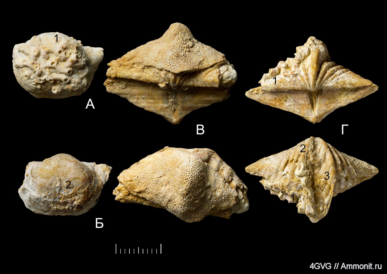 Интересная подборка (видовое разнообразие). Видимо на рис А и Б посмертные поселения, но надо смотреть экологию таких продуктид. №3 присутствует и на ареи брахиоподы рис В. Не совсем понятно поведение мшанки, часть ее колонии "свисает" с брахиоподы рис В (просьба сфотографировать мшанку снизу, чтобы посмотреть, как она "соединяется" с брахиоподой). На рис Г №1 похоже на прижизненное (просьба сфотографировать коралл сверху, посмотреть как он располагается вдоль коммисуры брахиоподы), а №2 посмертное поселение.