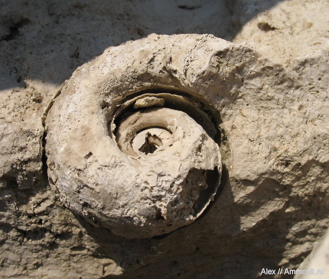 Раковина брюхоногого моллюска Bellerophon sp. Эти гастроподы названы так за сходство с шлемом древнегреческого героя по имени Беллерофон. На снимке видны остатки тонкой окаменевшей раковины моллюска, но в основном она разбита и виден слепок - заполненная породой полость раковины. Раковина крупная, около 6 см в диаметре. Снимок сделан в 2007 году в карьере Цемгигант.