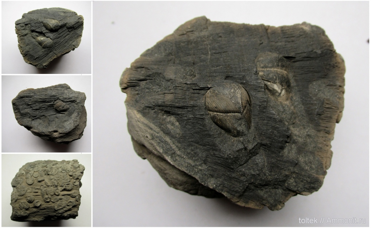 Фрагмент юрской древесины, найденный на территории Московской области. Древесиной в те далекие времена активно питались представленных на фото двустворчатые моллюски. На фото также видны входы моллюсков в древесину, только диаметр «дверей» значительно меньше самих раковин. Скорее всего, на эту древесину попали ювенальные особи, продолжившие расти уже внутри.