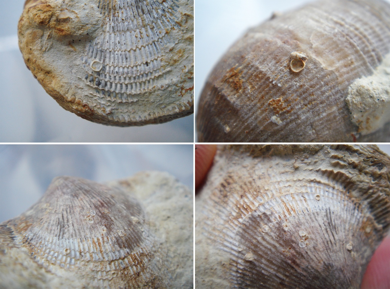 На трех брахиоподах Atrypa встретились небольшие и интригующие обрастатели размером 1-2 мм. Встречаются как по одиночке, так и гирляндами.