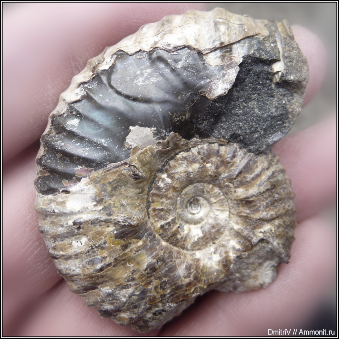 Разбирая давно найденную конкрецию, обнаружили ещё один аммонит с залеченным прижизненным повреждением.
