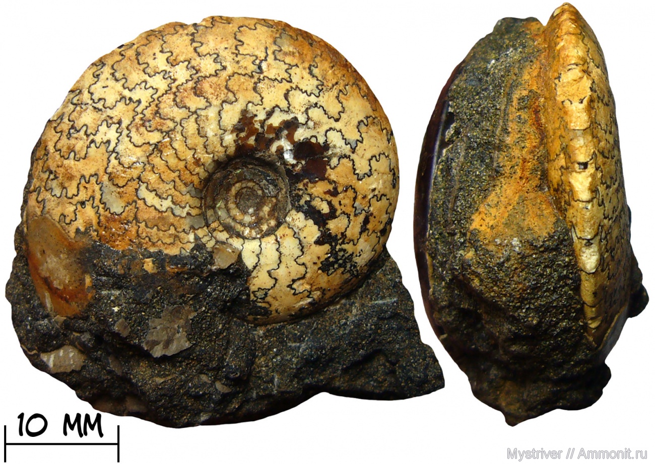 Очень красивый аммонит!!! Хорошо видно как учащаются лопастные линии, а камеры становятся более узкими к концу фрогмакона. | ||||||