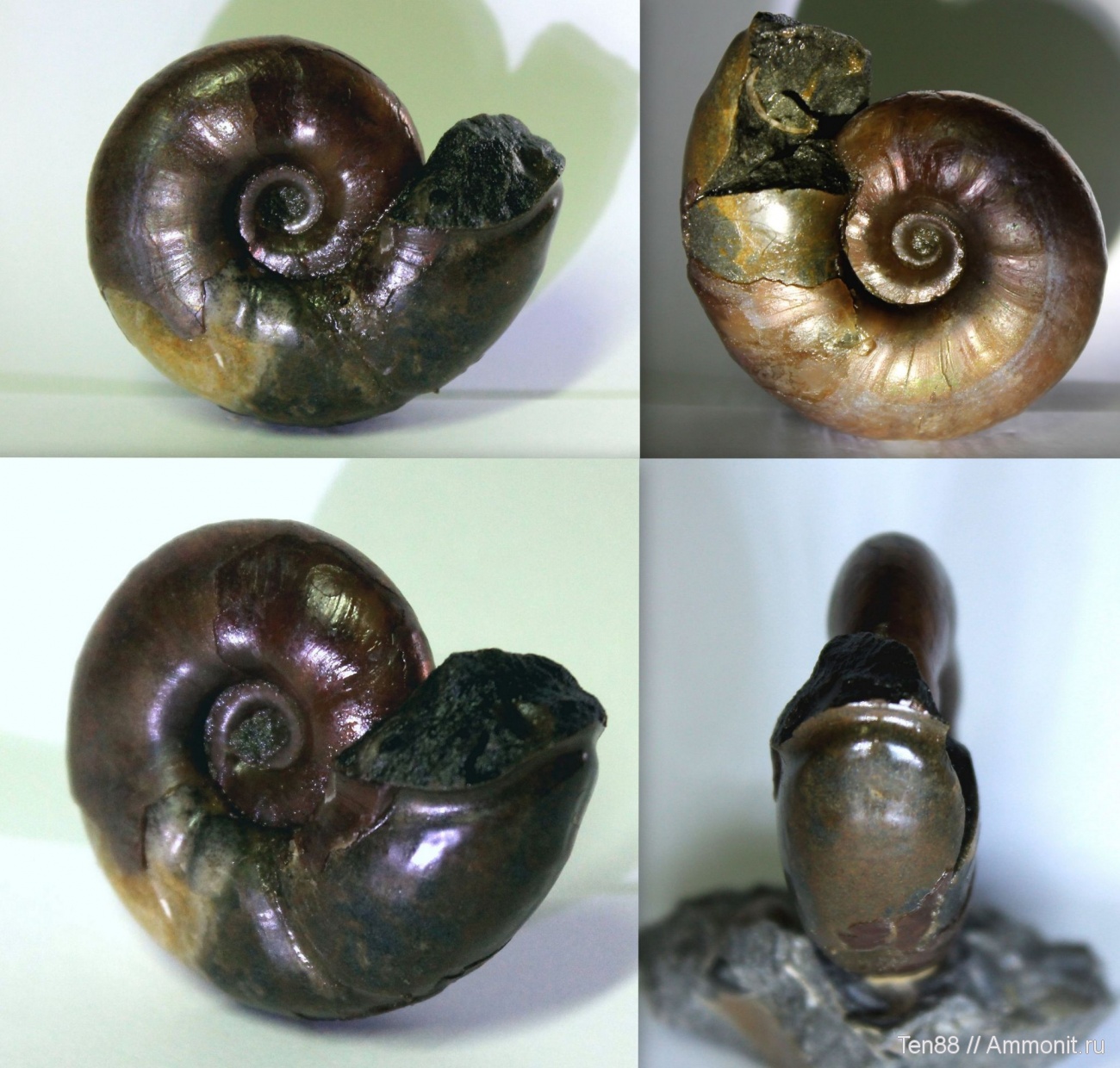 Да нет, в породе больше ничего не было, никаких намеков, что должен быть еще оборот. Ни в раздавленном-придавленном виде, не в виде отпечатка или чего либо другого. Такое вот бывает, когда предмет одной частью находится например в воде, поэтому одна часть от другой отличается по цвету. Ну или, опять же как предположение, порода изначально закрывала его вот так (по краю и "гуляла" водичка, потом его полностью упаковало в породу. Ну, вобщем, даже не знаю :))) | ||||||