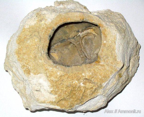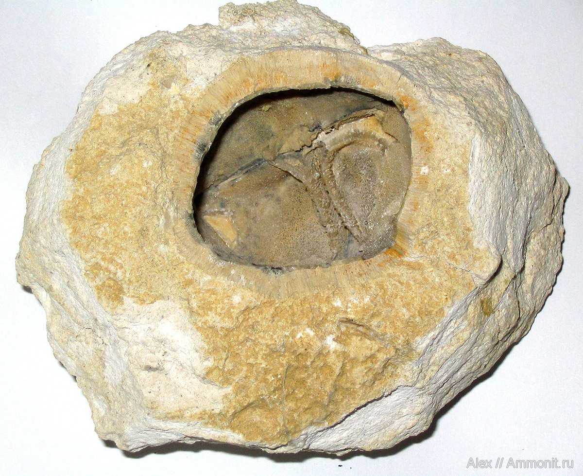 На снимке - внутренняя поверхность раковины брахиоподы Choristites mosquensis. Хорошо видно внутреннее строение раковины. Снаружи брахиоподу оброс хететес (Chaetetes radians). Хететес, ранее считавшийся колониальным кораллом, по современным представлениям является губкой. Он обрастал все предметы, долгое время лежащие на дне. И здесь мы видим пример такого обрастания.