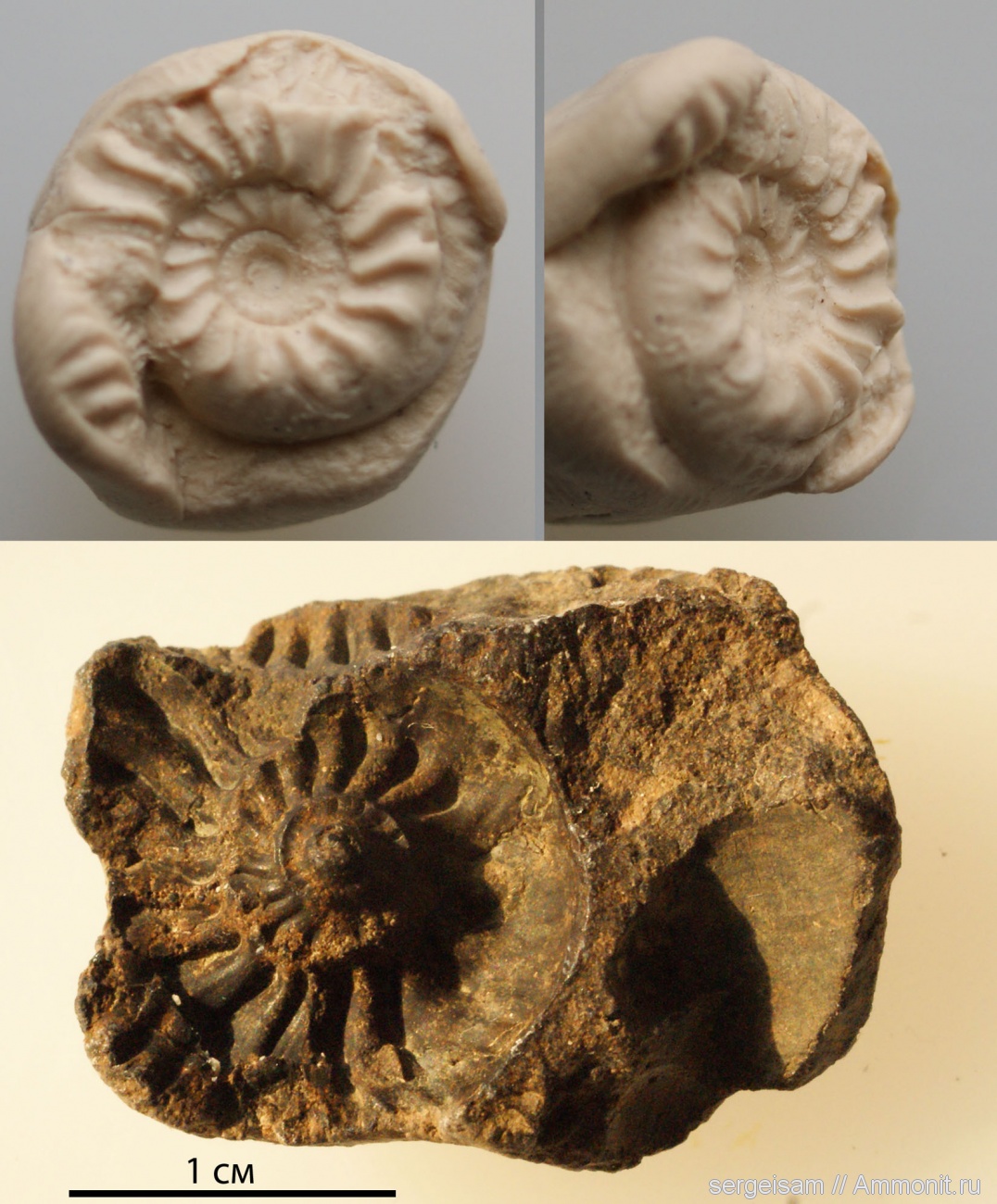 Алексей, слепок сделан по твоей технологии из полимерной глины, правда я его ещё не запекал. Вот с таких отпечатков почти половины аммонита слепки получаются отлично, а вот из пополам расколотой конкреции с "пустым" арктхоплитесом у меня ничего не получилось. У полимерной глины слабоватое внутреннее напряжение, с формой у неё сцепление больше. Может быть глину чем-то армировать надо или поверхность формы чем-то нужно обрабатывать? | ||||||