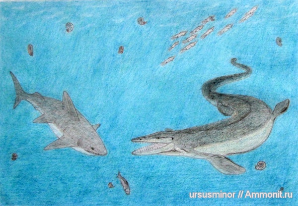 Примерно 7-метровый мозазавр нападает на 4-метровую акулу, до этого увлекшуюся погоней за рыбой. Кругом плавают белемниты Belemnitella, аммониты Pachydiscus и наутилусы. Часть аммонитов втянула щупальца, а один, задетый плавником мозазавра, качнулся вбок. Крым, верхний маастрихт.