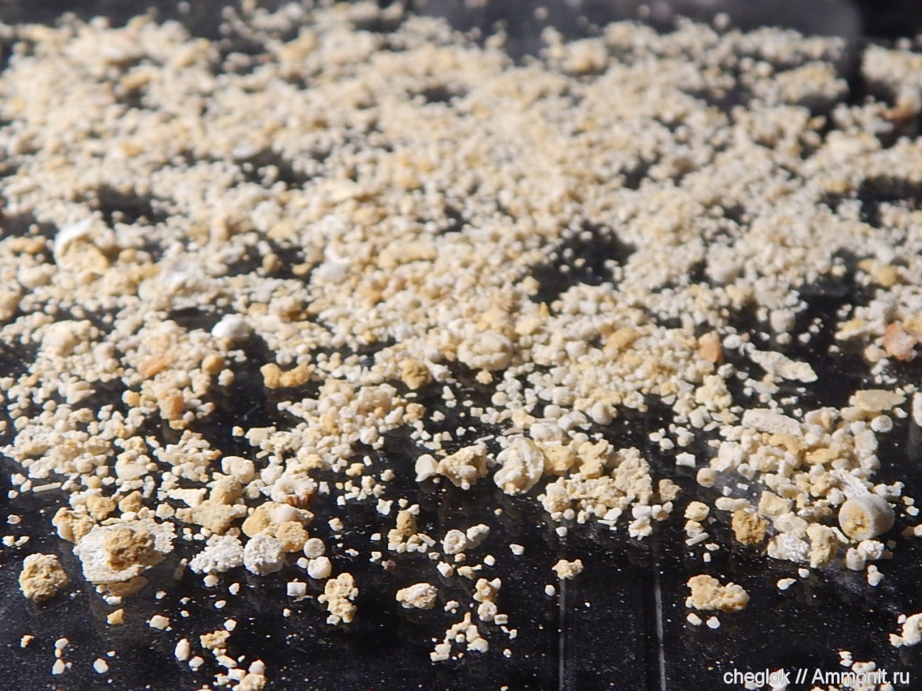 Обещанная Татьяне фотография. Порода из Русавкино, подвергавшаяся растворению. На мелком сите остался отсев, на мой взгляд почти на 50, а то и более процентов состоит из малюсеньких и чуток поболее члеников лилий. Похоже, мелких лилий там было много. Жаль, целыми они не попадаются пока. Фото под другим углом Фото