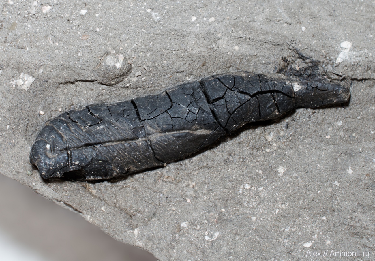 У него очень характерная форма - сзади широкий, спереди узкий, виден переход в канал, через который выбрасывались чернила. И он очень однородный. Я не видел совершенно однородных копролитов, а чернильный мешок однородный, состоит целиком из меланина: фото. | ||||||