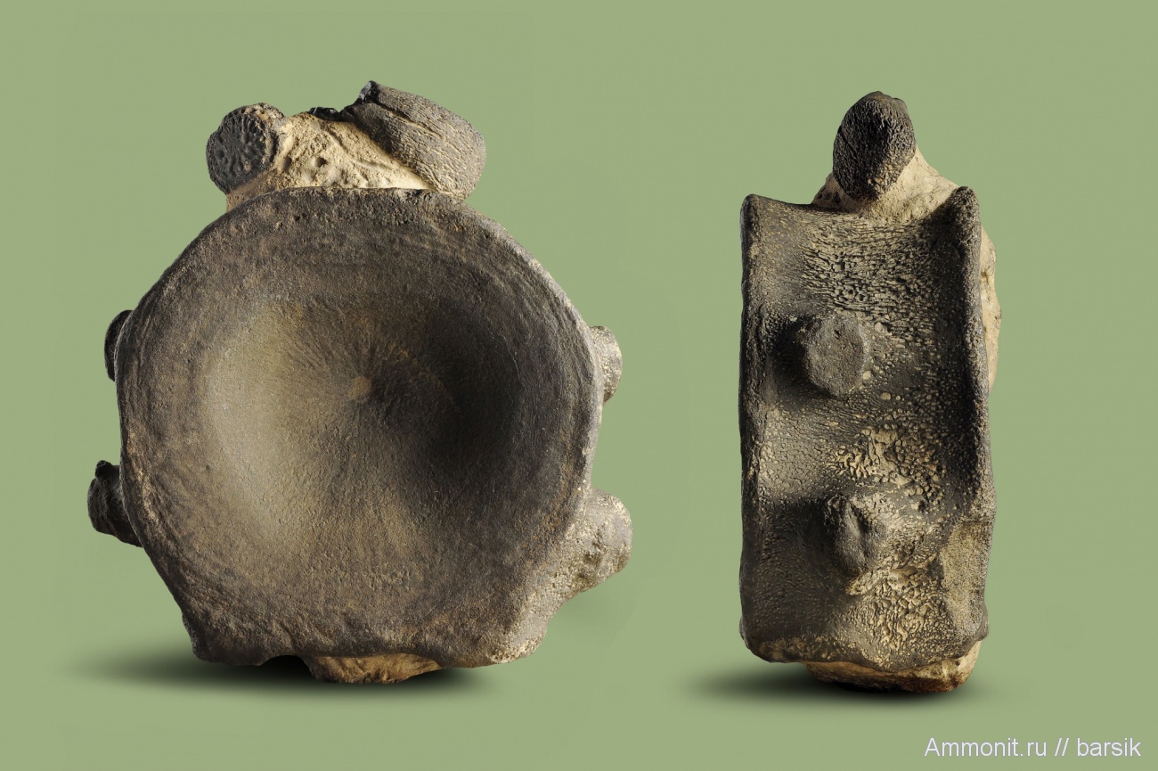 Отличная сохранность и необычный комплект - с зубом и фалангой. Аммонитов, налипших на позвонки, я видел, а вот зубы еще не встречал. Хорошо его там на дне перемешало в свое время. | ||||||