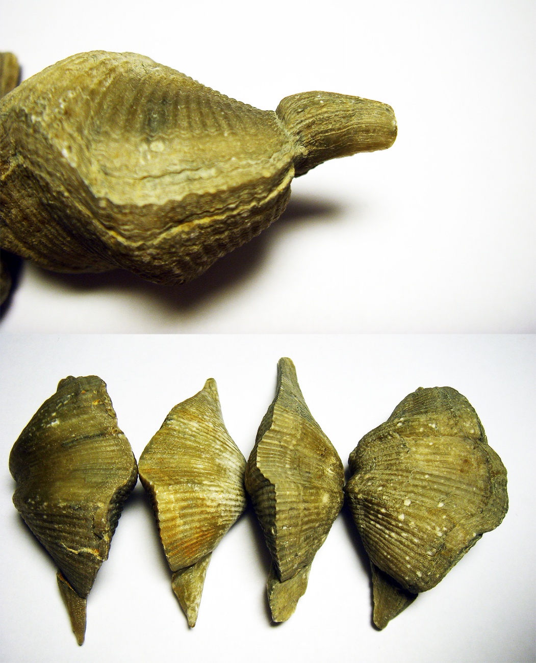 На фотографии представлено типовое явление в виде искривления ушек раковины Cyrtospirifer. При этом на всякий случай стоит отметить, что это не раковина была мягкая / пластичная, а имеет место быть огибание мантией брахиоподы (и выделяемого ею раковинного вещества) встретившегося препятствия постепенно по мере роста брахиоподы. Здесь важно, что шрамы или повреждения у брахиоподы не наблюдаются.