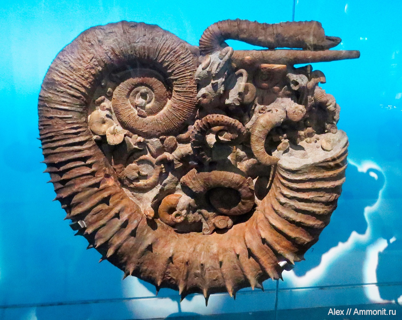 На этом фото - скопление гетероморфных аммонитов, которое я в начале прошлого года сфотографировал в Musée des Confluences (переводится как "Музей Слияния") в городе Лион, Франция. Размер скопления - больше метра. Самый крупный аммонит относится к роду Emericiceras (вот фото таблички к этому экспонату). Жили эти гетероморфы в барремском веке раннего мела.
