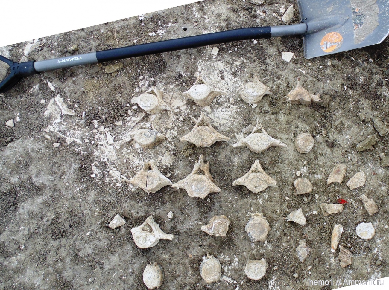 Действительно, похоже что большая часть костей от одного животного. Но не только. Это скорее похоже на линзу со скоплением различных костей. Там же были и мелкие позвонки явно других особей. Позднее я нашёл ещё несколько крупных и маленьких позвонков и разные запчасти. | ||||||