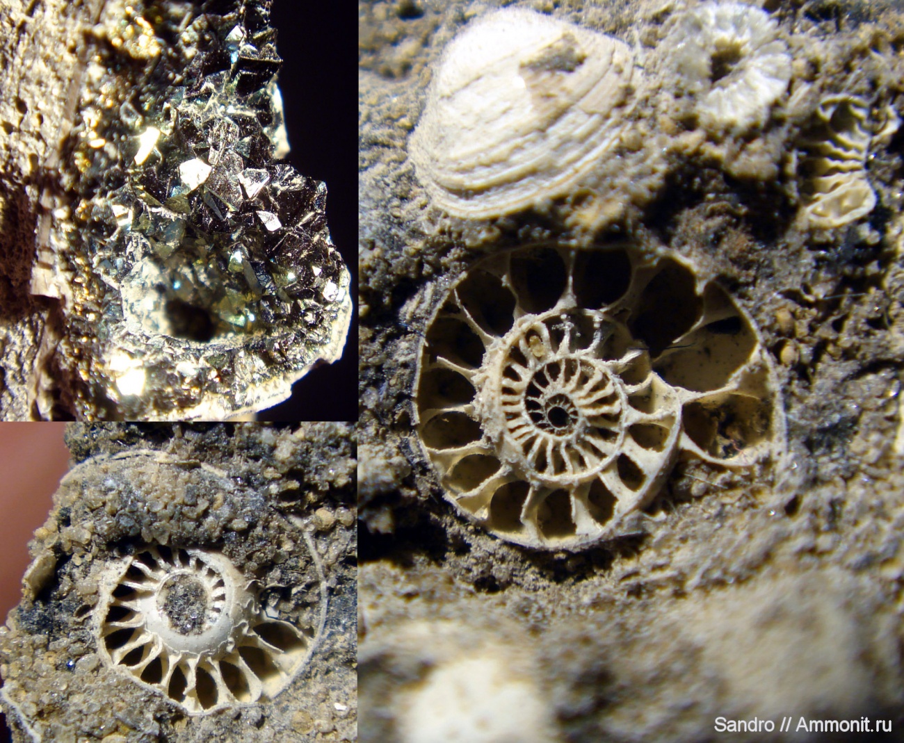 На первом фото пиритовые (марказитовые) наросты на межкамерной перегородке пустотелой раковины аммонита. размеры кристаллов ~ до 2мм. На других фото продольно расколотые молодые раковины Cadoceras sp.