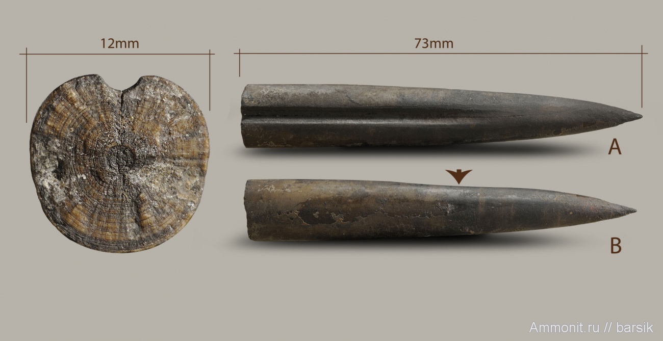 Это очередной нечастый представитель таксона, найденный восточнее села Даусуз. Мощные разрезы средней юры Юрские сланцы. , но совершенно пустые в этом месте. За десятки лет поиска - 2-3 непонятных отпечатка и кусок деревяшки. Судя по находкам в соседних разрезах, этот ростр скорее всего из самых верхов аалена( может и низ байоса).