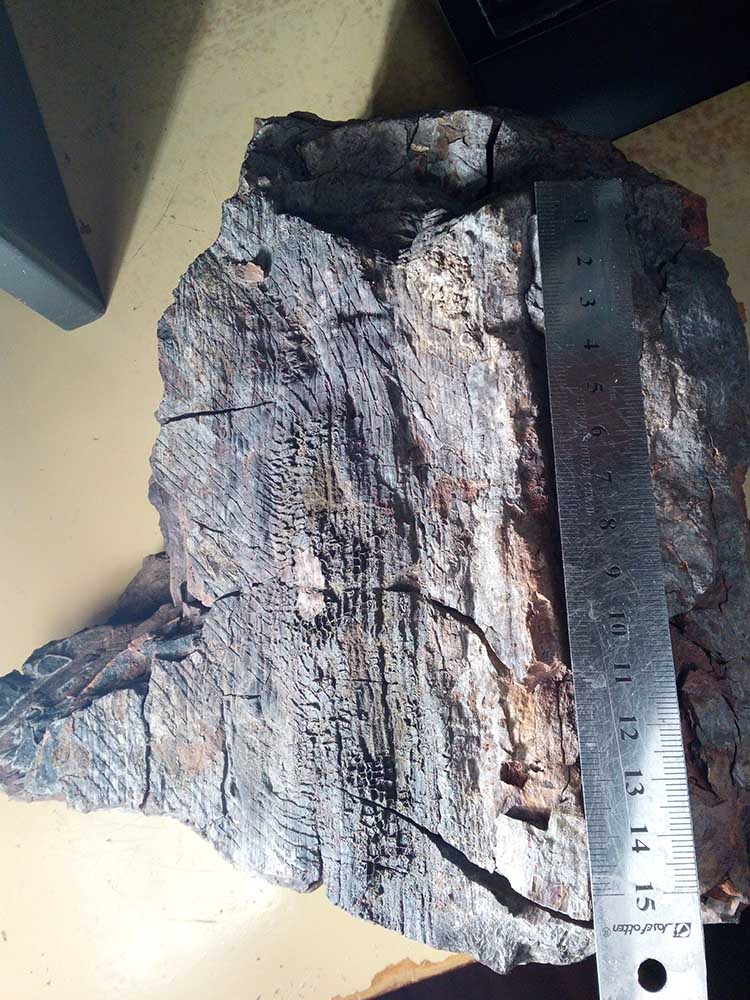 Спасибо, Михаил! Предполагаю, что это ствол юного плауновидного, так называемый "мохнатый столбик". В центральной части можно различить 4 неоднородности, напоминающие веточные рубцы, расположившиеся по вертикали. | ||||||