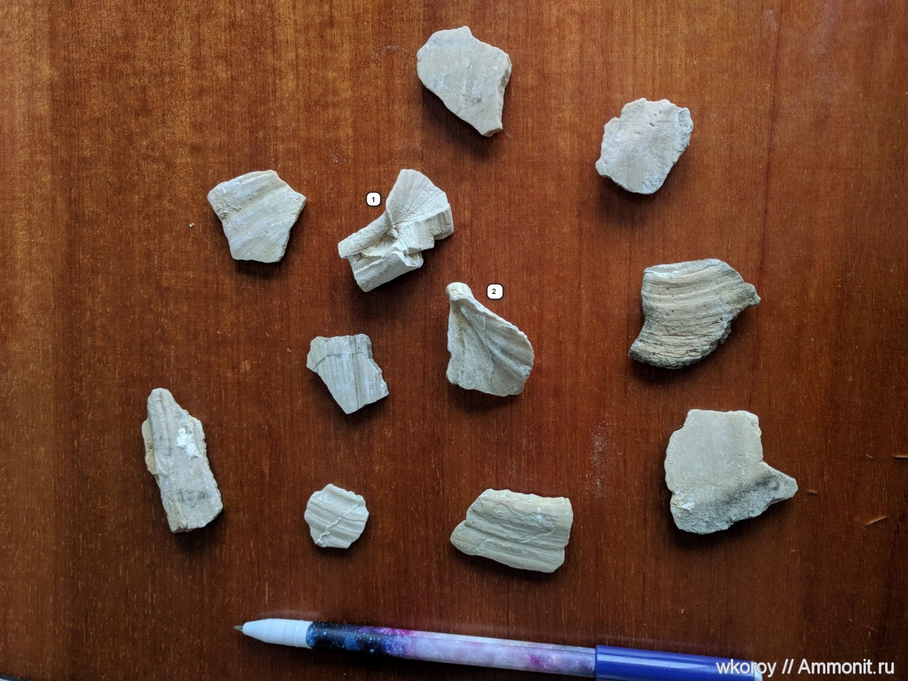 Обломки иноцерамусов, найденные неподалеку от с. Верхнее Турово Воронежской обл.Образцы 1 и 2 -замки иноцерамусов.