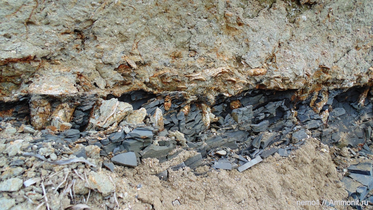 Прогуливаясь вдоль прибрежных обрывов в районе Керчи, я обратил внимание на любопытную деталь. На стратиграфическом срезе четко разделяются неогеновые синие глины и лежащие выше слои. На границе слоев видны многие десятки двустворчатых моллюсков, зарывшихся в придонный ил (их длина около 10 см). На мой сугубо непрофессиональный взгляд произошла резкая, единовременная смена характера осадконакопления, приведшая к гибели данных моллюсков, которые так и остались зарытыми в поверхностном слое донного ила. На дополнительном фото Фото дан вид снизу, слои синей глины осыпались, а моллюски, держась верхними кромками, остались на своих местах. Возможно, такие фотографии тоже окажутся полезны на сайте.
