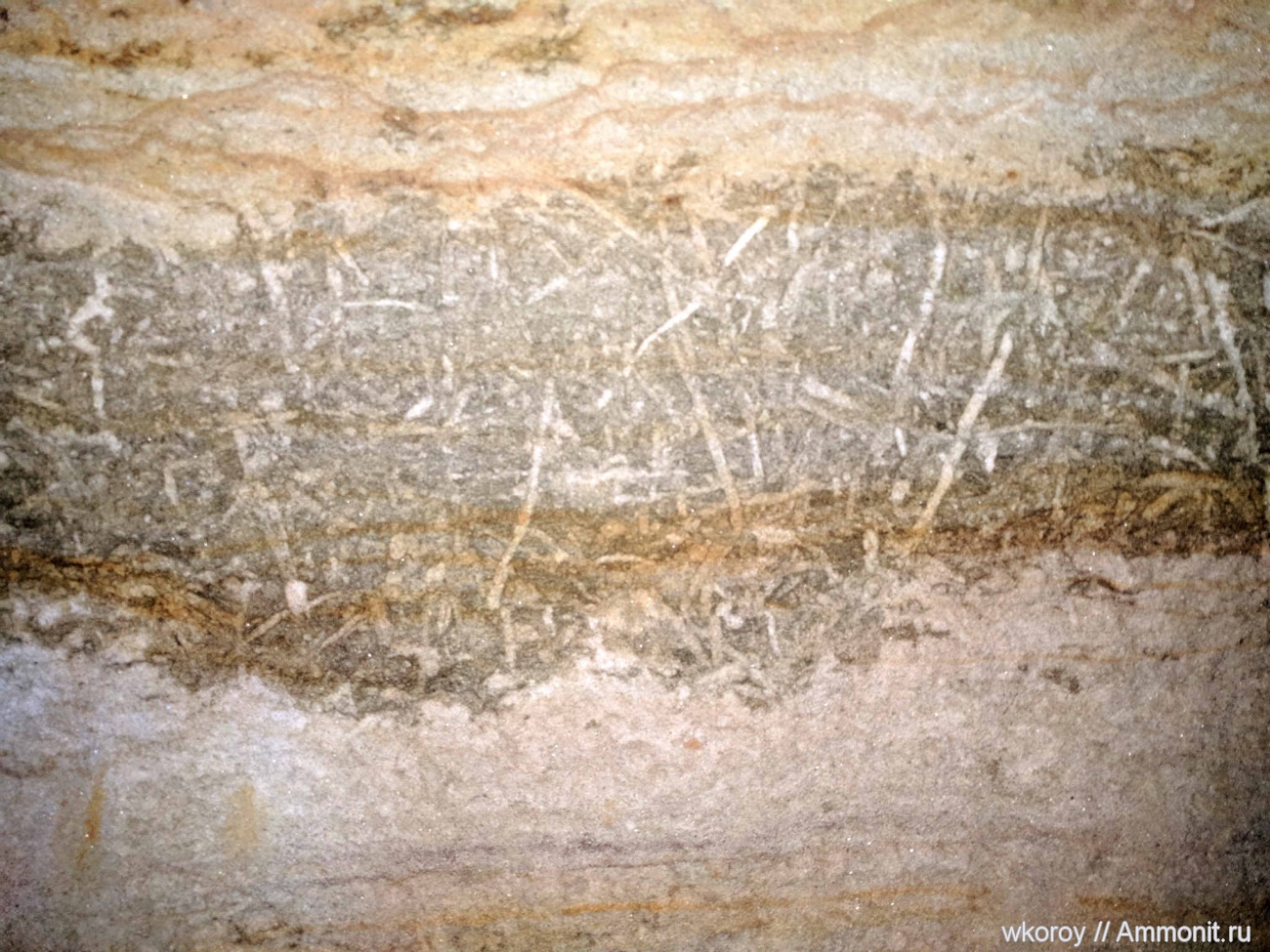 Слой организмов в песке. По виду темная составляющая - углерод, что наводит на мысли об остатках растений. Место находки с.Ушаково Курской обл.