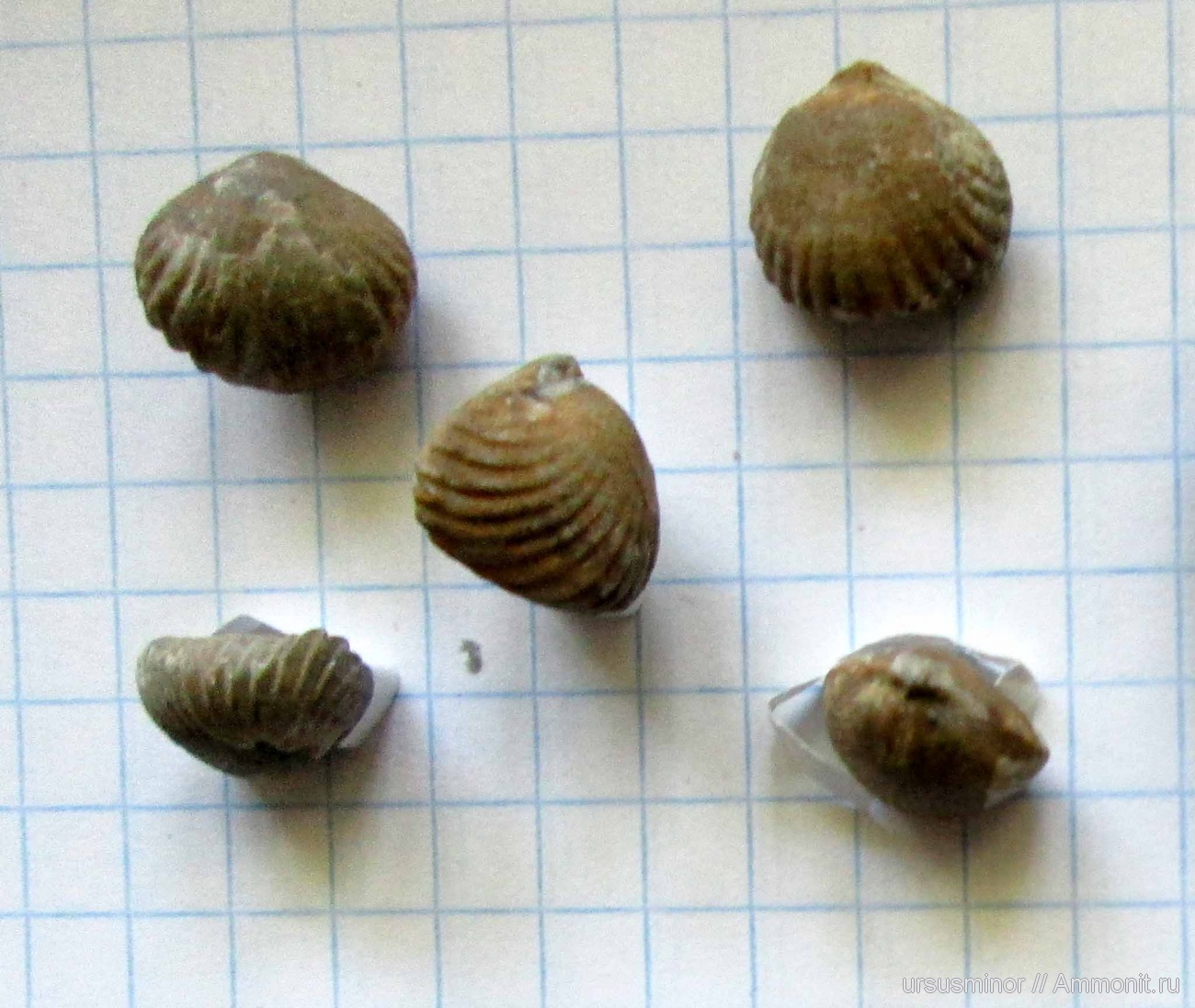 Пять брахиопод одного вида с разных сторон. Вскоре постараюсь определить. Крым, Новый Свет, средняя юра (келловей).