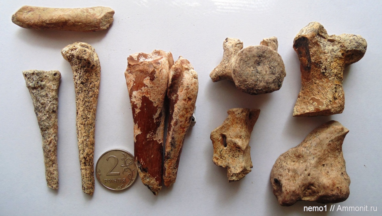 Очередные находки. В этот раз попались несколько тюленьих костей. Но, две крайние слева кости ввели меня в заблуждение. Явно не тюленьи, и навряд ли это вообще неоген. Обе косточки окаменевшие, но более легкие и даже по виду с другим замещением. Может, времён гиппарионовой фауны?