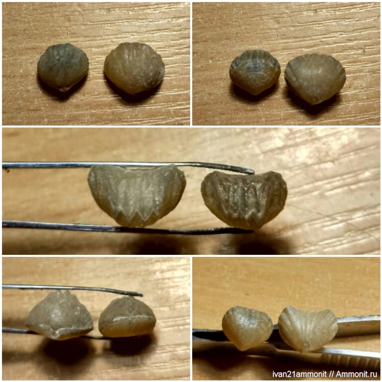 Хорошие брахиоподы Rhunchonellida. Размер 12*10мм. и 10*8мм. Просвечиваются. Карбон.