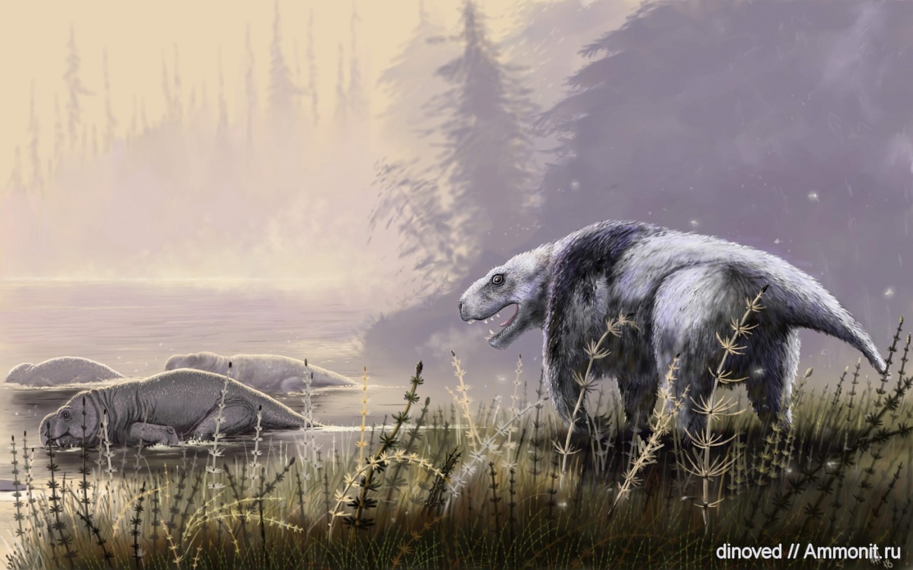 Мегавайтсия ( Megawhaitsia patrichae) — гигантский тероцефал из терминальной поздней перми Владимирской области решил подобраться поближе к дремлющим на мелководье дицинодонтам.