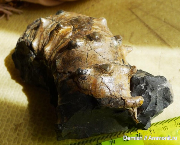 Прыгая в конце апреля по льдам Куйбышевского водохранилища, подобрал этот фрагмент, с достаточно интересной формой шипов. Главное в них, то, что они не обломаны и вполне закончены. И так же как и на остальных когда либо найденных мной Audouliceras, они не огромны, а вполне компактны, или просто складки. А были ли эти страшные шипы. Кто-то видел их отпечатки? Например, как у Aspidoceras. Может это просто усиление раковины. От боковых ударов, от тех же укусов (сжатий).