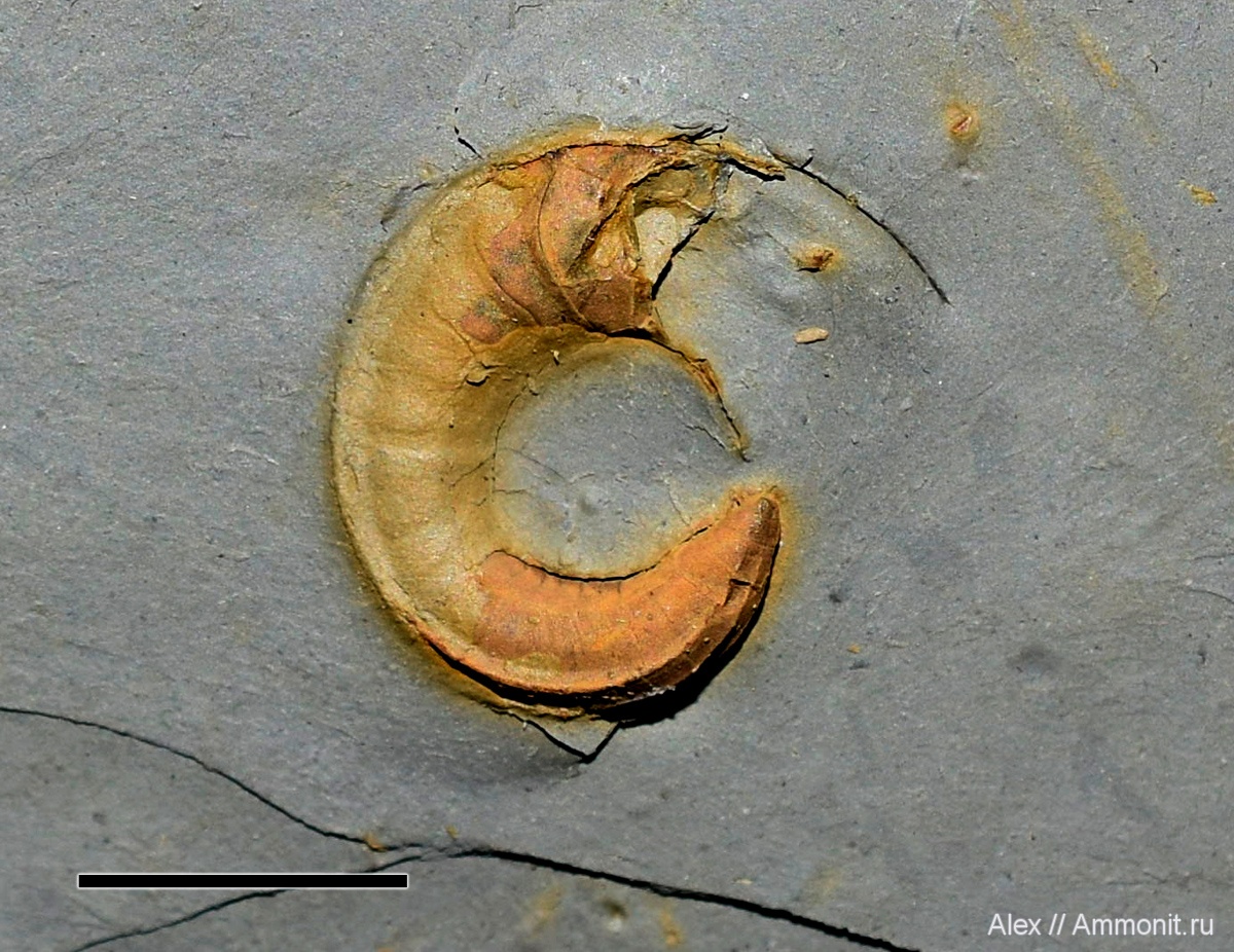 Маленький Catastroboceras из стешевских глин нижнего карбона. Ядро изначально было пиритовым, а теперь заместилось лимонитом. Длина масштабного отрезка 0,5 см. Каменноугольные наутилоидеи рождались с раковиной в половину оборота, а взрослые представители этого рода имели полтора-два оборота, так что этот наутилус явно умер молодым.
