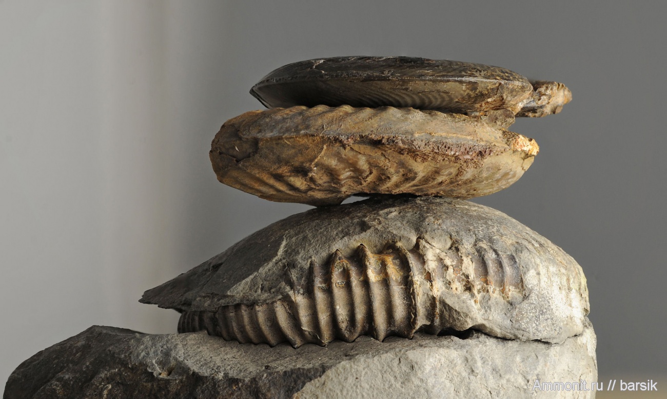 Осенью прошлого года на исхоженном вдоль и поперек разрезе нижней части зоны Parkinsoni (подзона Acris [=Subarietis] в нижнем течении р.Кяфар попалась очередная конкреция. По краю конкреции очень невнятно проступал вентр аммонита прикрытый породой. Как очередной рарекоститес, эта находка упала в коробку и пролежала там до зимы. В конце концов любая конкреция все равно вскрывается и вот неожиданный подарок с совершенно незнакомым вентральным краем. На снимке он самый нижний, вверху два ааленских.