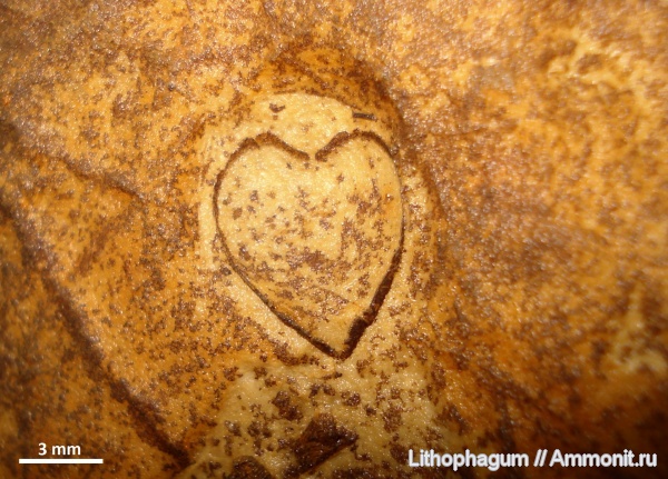 Естественный срез ядра двустворчатого моллюска, отпрепарированный напорными (гипогенными) карстовыми водами.
