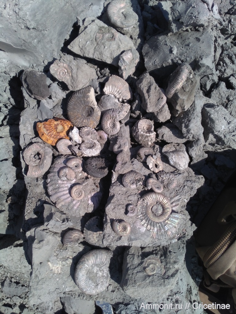 Часть сбора аммонитов за 2018 год на месте раскопок. Здесь аммониты следующих видов: Binatisphinctes, Kosmoceras, Brightia, Cardioceras, Erymnoceras.
