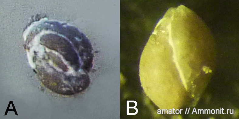 Спасибо! Думаю А и В - ядра, а белые участки на них - остатки раковин. В этом ракушняке таких фораменифер много, в том числе с более менее целыми раковинами, но все что пересматривал в неудачных ракурсах торчат из породы или поломаны. И раковины очень хрупкие - сложно красиво вытащить. Пришлось пока сфотографировать ядра. | ||||||