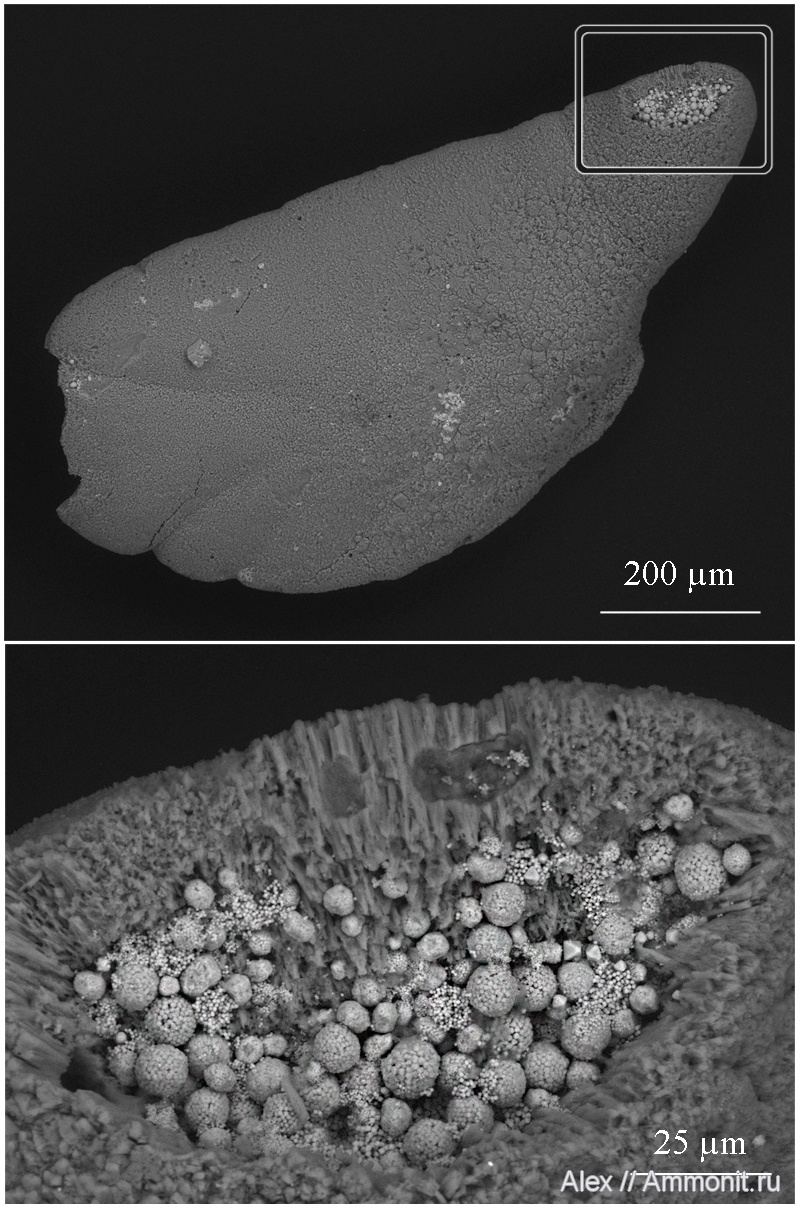 Находка на границе палеонтологии и минералогии - колеоидный статолит из отложений среднего келловея с фрамбоидальными агрегатами пирита (сферические образования в "носике" статолита). Фрамбоидальный пирит в данном случае располагается в полостях в статолите. Хотя я видел много много статолитов, ни у одного из них, кроме этого образца, не было ни полостей, ни подобных пиритовых скоплений.