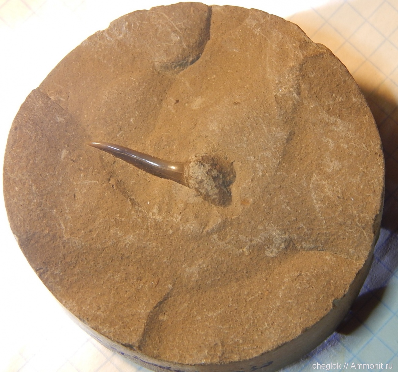 Все мы в детстве учил стихотворение А.С.Пушкина "К *** Керн".И когда я получил в дар этот образец, в голове так и закрутилось "Я помню чудное мгновенье..". К чему это я всё? Так зуб то сидит в куске керна из Казахстана!Прикиньте, какова вероятность того, что практически целый зуб будет найден в куске керна весьма немалой прочности. Размер зуба 25мм, скорее всего Xiphodolamia.
