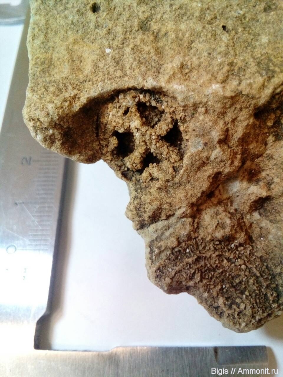 Одна из вершин крестика расходиться на две маленьких. Диаметр "крестика" 1,5 см. Ниже еще один отпечаток чего-то плохо сохранившийся. Есть у кого-нибуть предположения что это может быть?