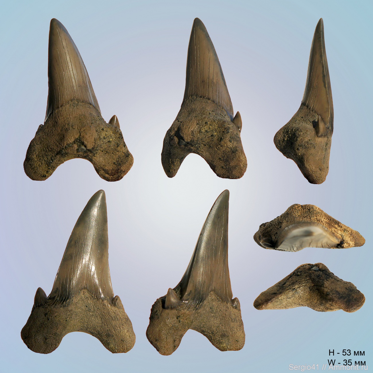Теперь, собственно, к определению принадлежности. Все отодусы, что я находил в том месте, специалистами определялось как Otodus minor. Но, тем не менее, с этим экземпляром я снова прошу помощи в определении. Я пересмотрел, всю доступную мне литературу и считаю, что это передний обликус. На elasmo.com вообще брат близнец, даже по цвету :-)))
