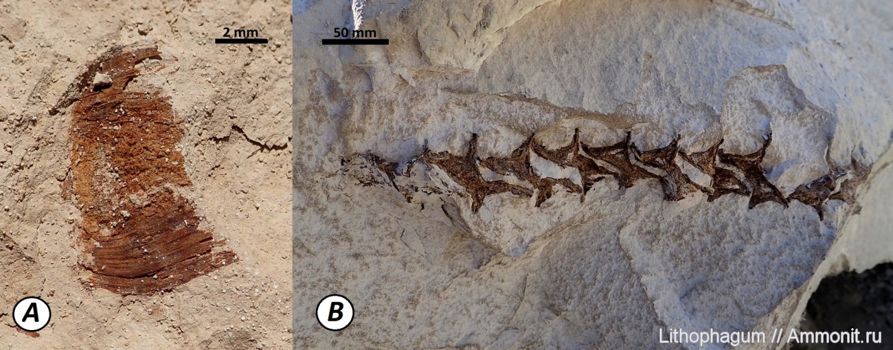 Породы лиролеписового горизонта состоят из толщи переслаивания светло-коричневых мягких мергелей и шоколадно-бурых слабо битуминозных слоистых известковистых глин, поэтому остатки рыб очень хрупкие и даже от легко воздействия способны разрушится. На представленном фото показаны самые целые останки, что удалось найти: а. фрагмент чешуи; б. срез позвонков.