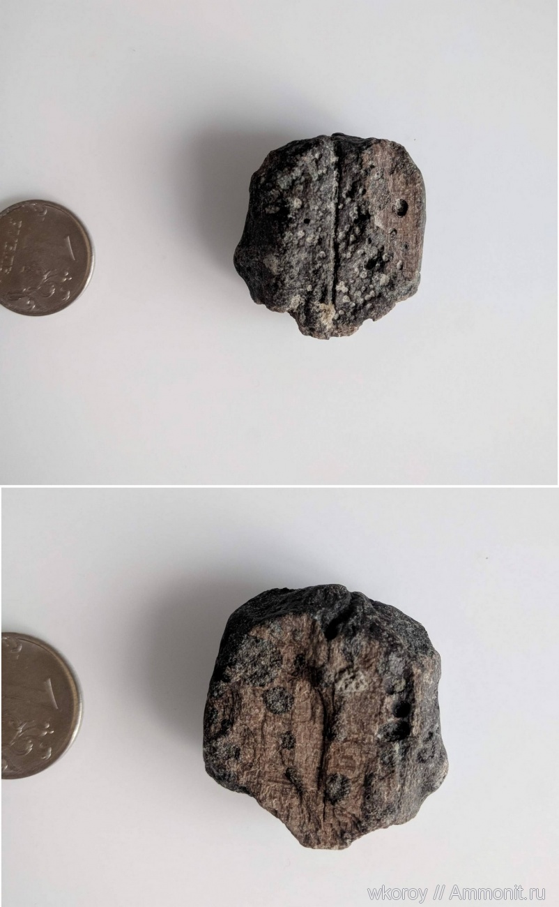 Фосфоритизированный фрагмент дерева из песчаных отвалов с отверстиями от насекомых. Измерение радиоактивности этого фрагмента показало 0,248 мкЗвт/час