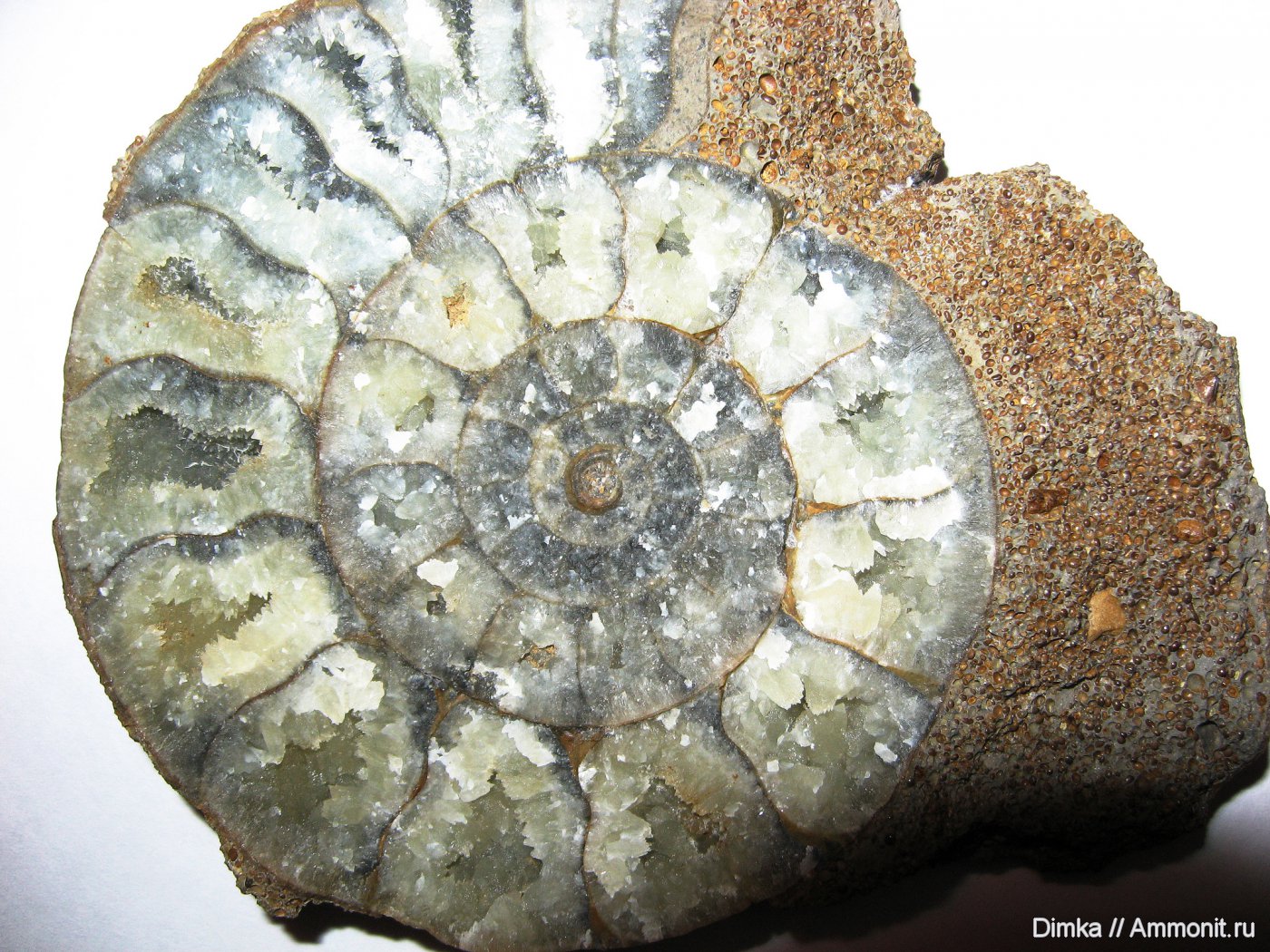 Внутри расколовшейся раковины аммонита из рода Indosphinctes, отчетливо видны отсеки воздушных камер, заполненных кальцитом, а в середине видна начальная стадия роста его раковины, диаметром 2 мм. Диаметр всей раковины около 10 см.