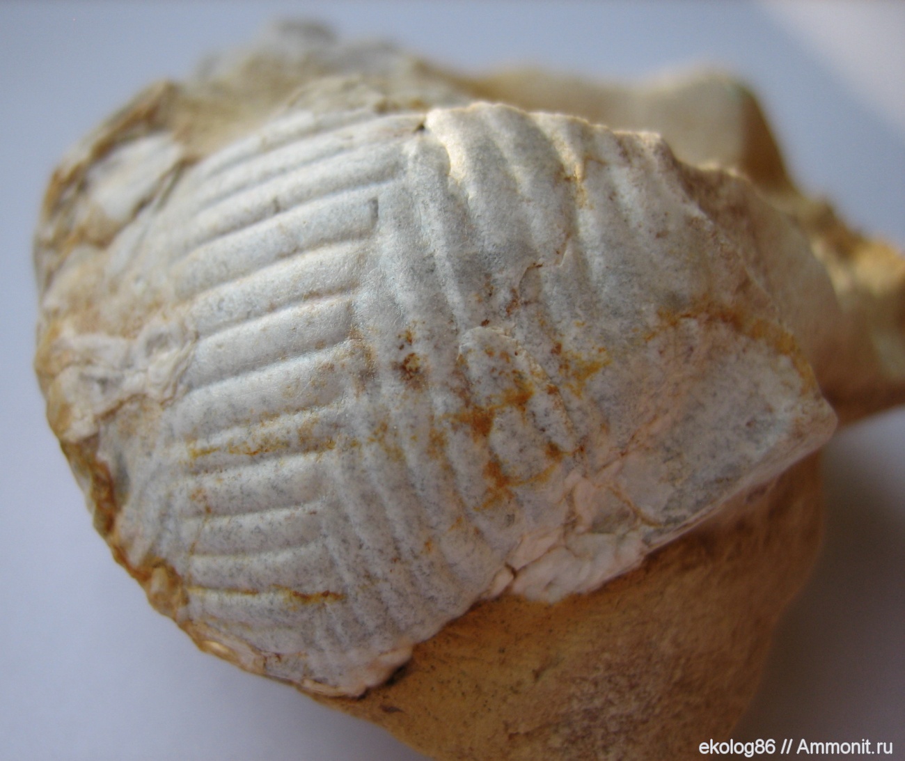 Образец был найден в Липицах (киммеридж). Длинна 2см на куске спонголита. Необычен рисунок - расходящиеся или наоборот сходящиеся к центру ребра. По состоянию образца не похоже, что это что-то расплющенное. В таком цвете в Липицах сохраняется перламутр. В галерее Липиц я подобного не нашел, единственное похожее фото Странная окаменелость . Было высказано предположение, что это двустворка. Помогите с определением образца. Дополнительное Фото