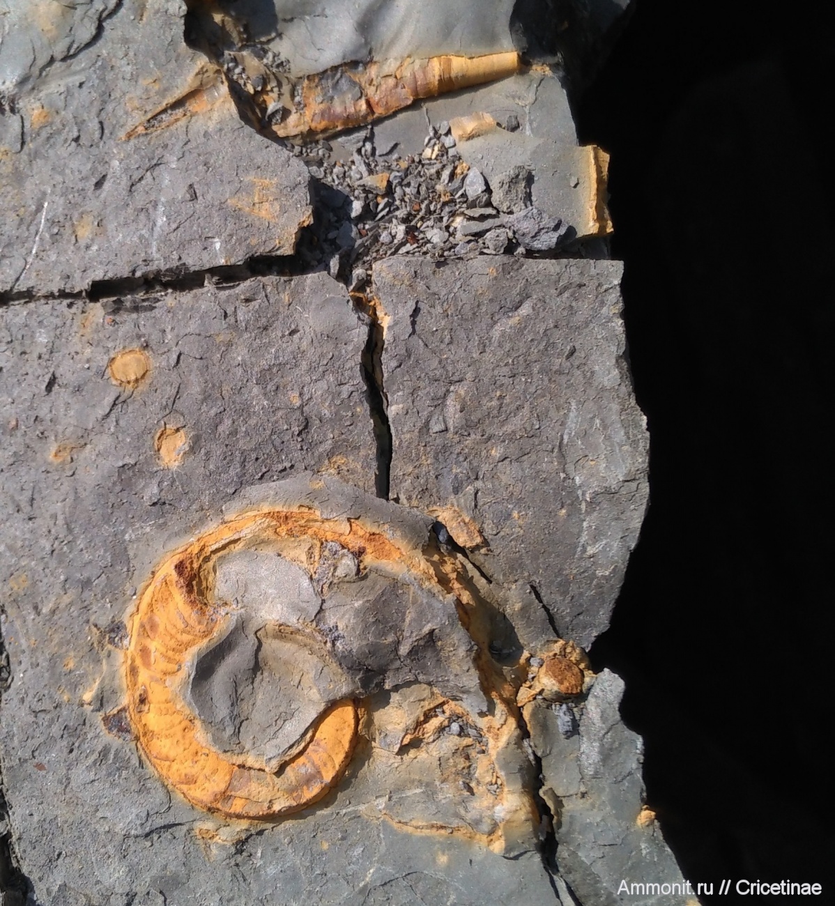 Наутилус Catastroboceras, замещённый лимонитом в коренной породе стешевской глины. Размер около 3 см. Сверху от наутилуса залегает прямораковинный головоногий моллюск Orthoceras.